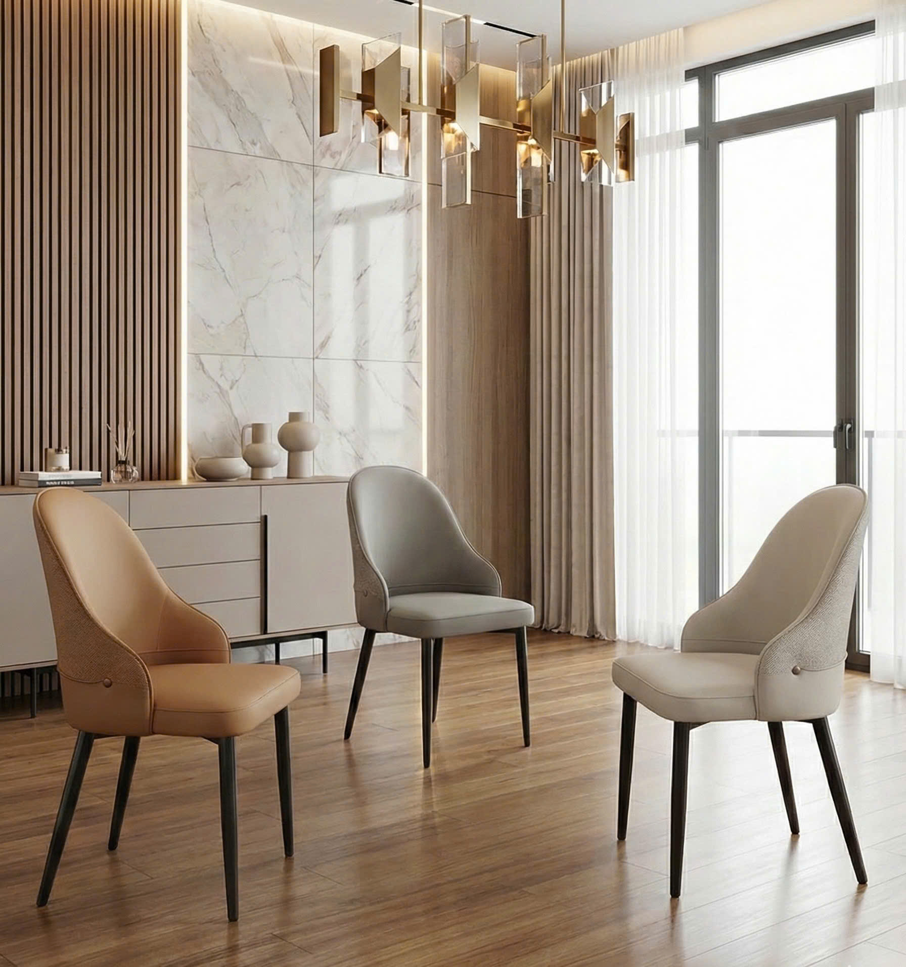 Ghế ăn hiện đại không chỉ giới hạn trong các tông màu trung tính như xám, trắng, be, mà còn có thêm nhiều lựa chọn nổi bật như xanh olive, cam cháy, nâu socola, hoặc pastel nhẹ nhàng – giúp bạn dễ dàng phối hợp với bàn ăn, thảm hoặc tủ trang trí.