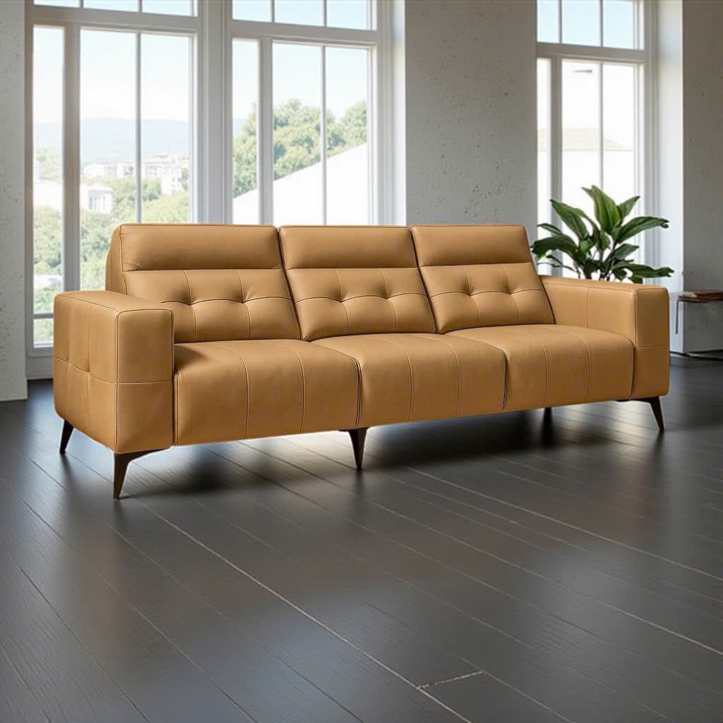 Sofa B11 sở hữu đường nét hiện đại, vuông vắn nhưng không kém phần mềm mại nhờ phần may chần ô vuông nổi bật trên bề mặt ghế và tay vịn. Gam màu nâu sáng thanh lịch dễ phối với mọi phong cách nội thất, từ Scandinavian, Minimalism đến Contemporary. Phần chân sắt sơn tĩnh điện thiết kế thanh mảnh, giúp tổng thể nhẹ nhàng, tinh tế hơn.